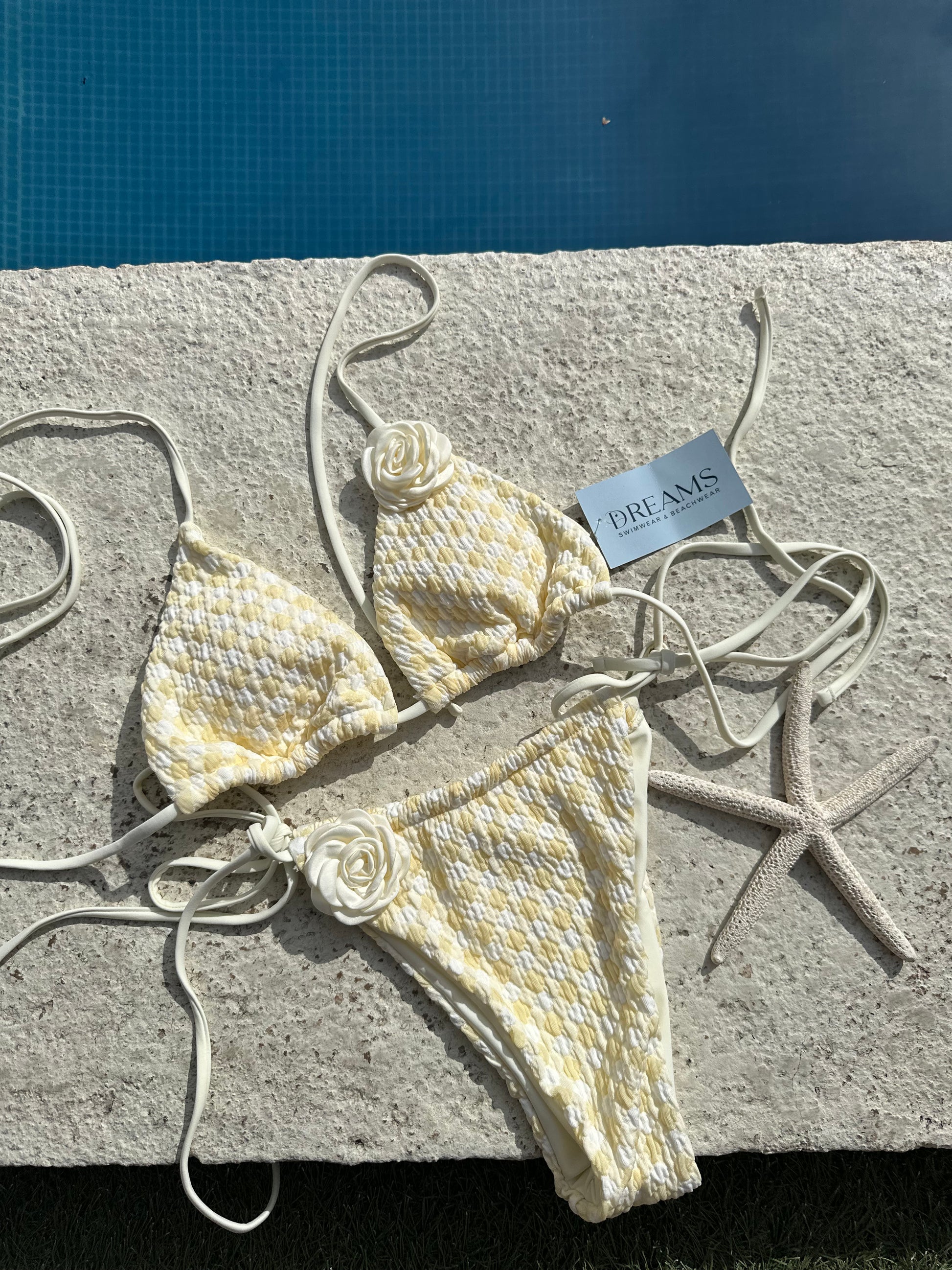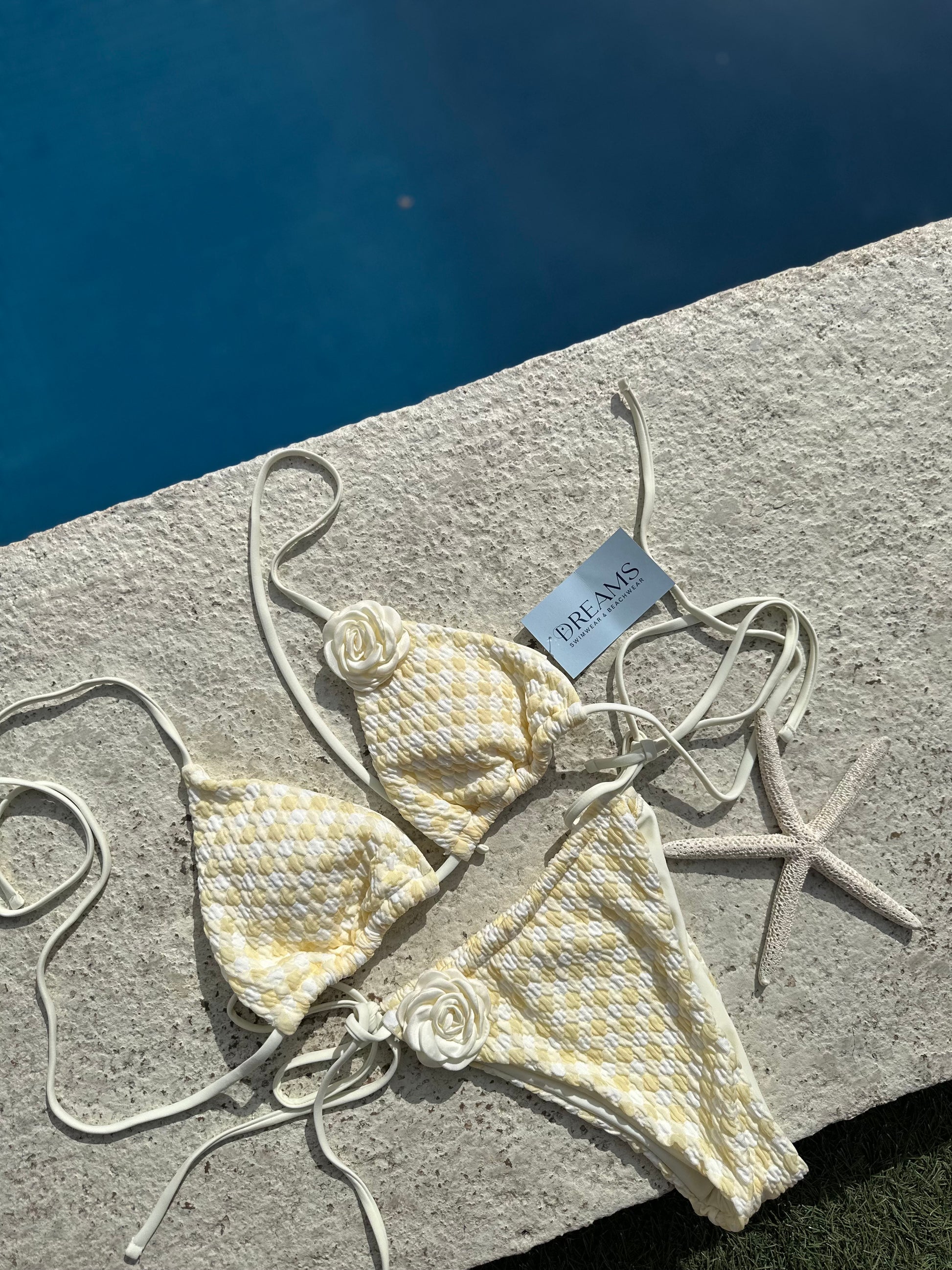 Bikini ajustable de top halter, de tela de cuadritos amarillo con flores 3D amarillas.